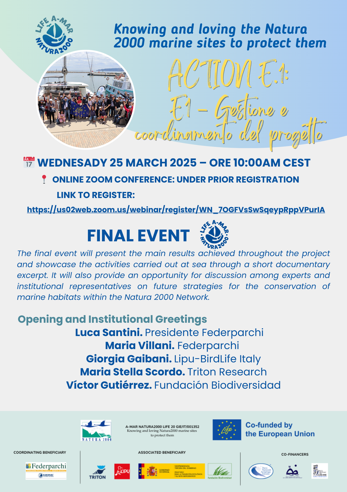 El próximo 25 de marzo de 2026, de 10:00 a 11:50 (CET), se celebrará en línea el evento final del proyecto LIFE A-MAR NATURA 2000, un encuentro dedicado a presentar los resultados alcanzados y a debatir las perspectivas futuras para la conservación de los hábitats marinos dentro de la Red Natura 2000 en Europa.