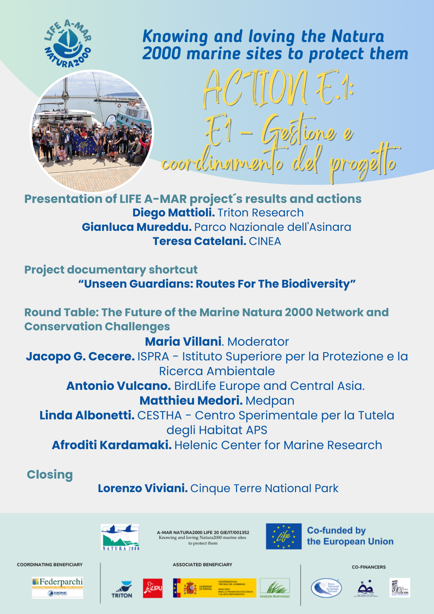 El encuentro representa así un momento de síntesis, en el que los resultados de LIFE A-MAR NATURA 2000 se convierten en el punto de partida para nuevas estrategias y colaboraciones dedicadas a la protección del patrimonio natural marino europeo.