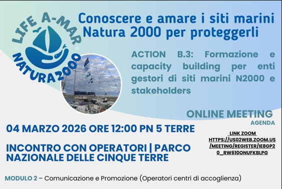 Federparchi ha concluido las acciones del proyecto LIFE A-MAR NATURA2000 con el Parque Nacional de las Cinque Terre, en particular la Acción B.3 «Formación y desarrollo de capacidades para los organismos gestores de los espacios marinos Natura 2000 y los agentes implicados», diseñada para reforzar las competencias, herramientas y colaboración entre gestores y población que habita en espacios marinos de la Red Natura 2000.